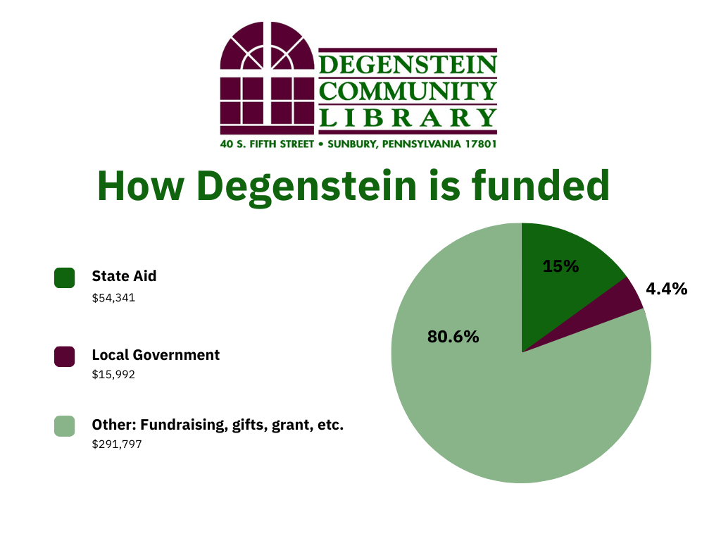 The tremendous growth of the library through the years would not have been possible without the support of the community, local and state governments, civic-minded individuals, corporations, foundations, and organizations, including United Way of Central Susquehanna Valley, the Degenstein Foundation, PPL Foundation, the SUN Whipple Foundation, and the Sunbury Area Community Foundation. Many have also contributed to the library their time and energy through Board membership, volunteer work, and participation in Friends of the Library.